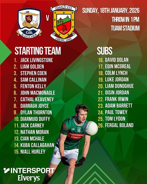 Best of luck to Liam, Sam, Dylan, Luke and Frank as Mayo take on Galway this Sunday at 1pm in the Connacht GAA FBD final in Tuam. The panel named features a number of alterations from the side that defeated Roscommon last weekend, blending fresh talent with experienced players getting important minutes. The two teams won’t have long to wait for a rematch, as Mayo and Galway are set to clash again the following Sunday, January 25th, in the opening round of the National League in Salthill.
