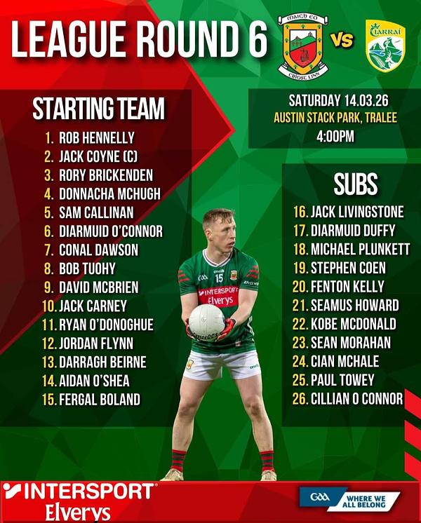 There are five changes to the side that started in the win over Armagh last time out. Donnacha McHugh, Diarmuid O’Connor, Conal Dawson, Darragh Beirne and Fergal Boland all come into the starting fifteen. Throw-in at Austin Stack Park is scheduled for 4pm.