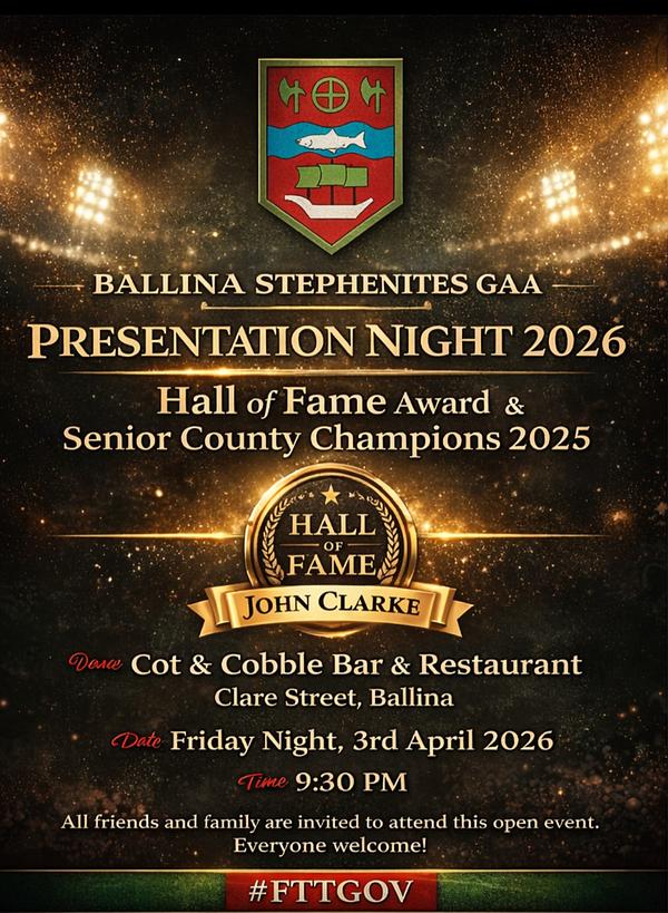 We will hold our presentation night for our Hall of Fame award and Senior County Champions 2025, in the Cot & Cobble Bar and Restaurant, Clare Street, Ballina this Friday night, 3/4/2026.